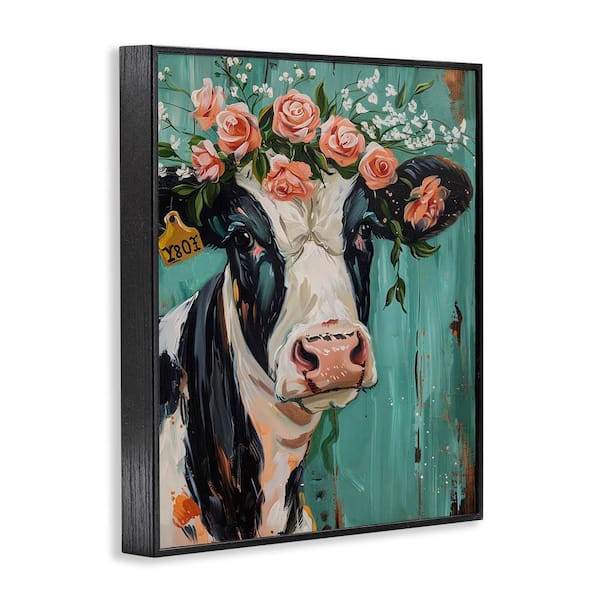 Floral Cow on teal by LSR Design Studio Black Framed Animal Giclee Art Print 14 in. x 11 in.