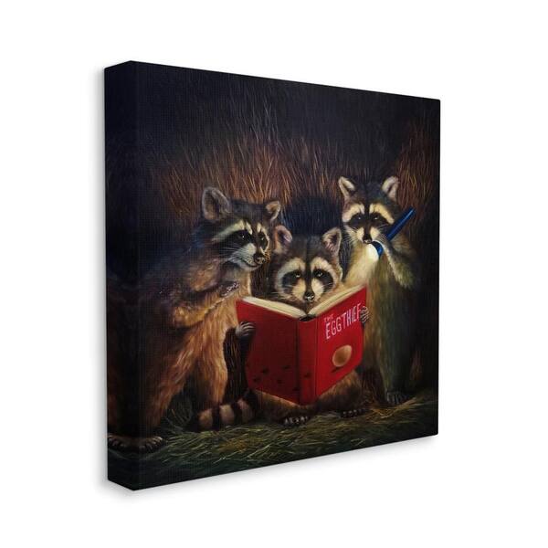 Fun Raccoon Trio Reading Book by Lucia Heffernan 1-Piece Wrapped Unframed Animal Graphic Art Print 24 in. x 24 in.