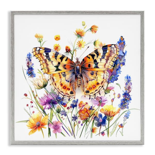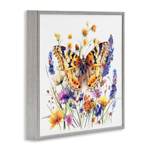 Garden Flowers and Butterfly by LSR Design Studio Gray Framed Animal Giclee Art Print 12 in. x 12 in.