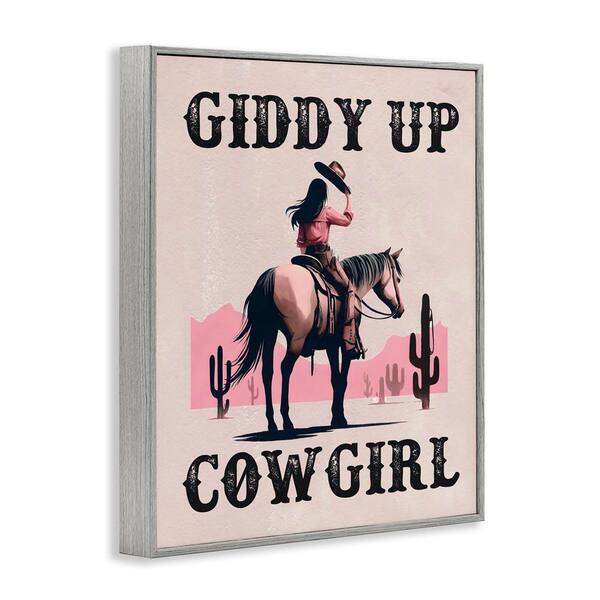 Giddy Up Brunette Cowgirl by Lettered and Lined Gray Framed People Giclee Art Print 14 in. x 11 in.