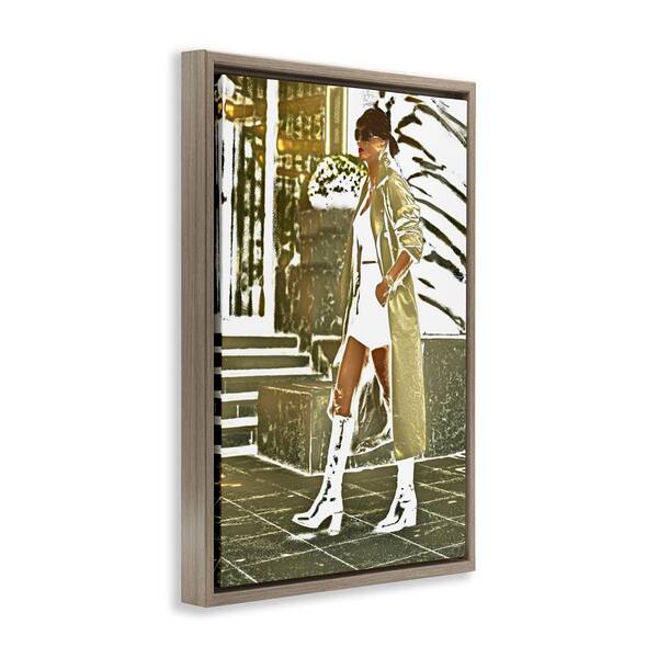 Girl in Gold Trenchcoat by Graffi tee Studios Brown Floater Frame People Graphic Art Print 31 in. x 21 in.