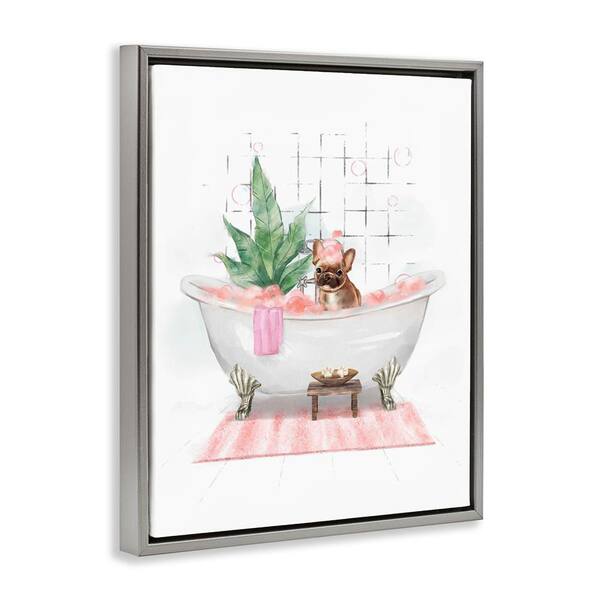 Glam Pug in Tub by Ziwei Li Gray Floater Frame Animal Graphic Art Print 31 in. x 25 in.
