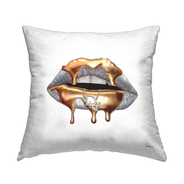 Glam Silver Lip Portrait Fashion With Gold Drip Printed Pillow Grey Square Outdoor Throw Pillow