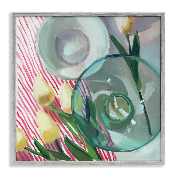 Glasses and Tulips Still Life by Jenny Westenhofer Gray Framed Nature Giclee Art Print 12 in. x 12 in.