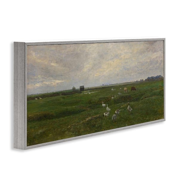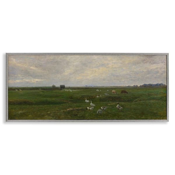 Grazing Ducks & Horses by Grace Popp Gray Framed Nature Giclee Art Print 13 in. x 30 in.