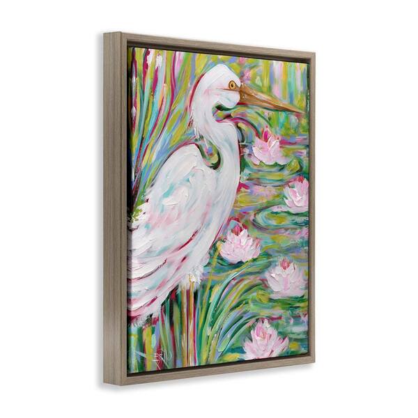 Great White Egret and Lotus by Estelle Grengs Brown Floater Frame Animal Graphic Art Print 31 in. x 25 in.