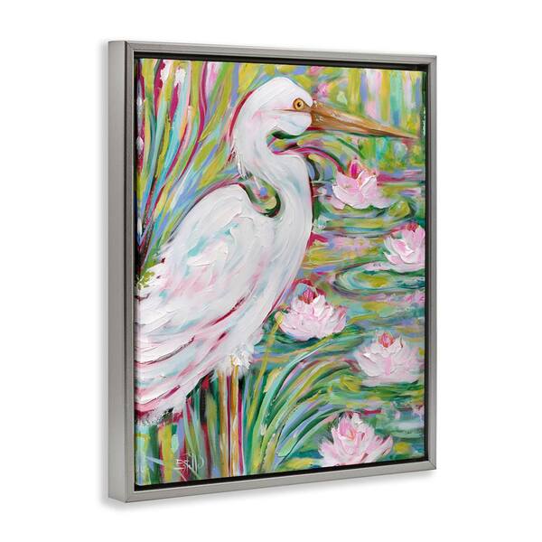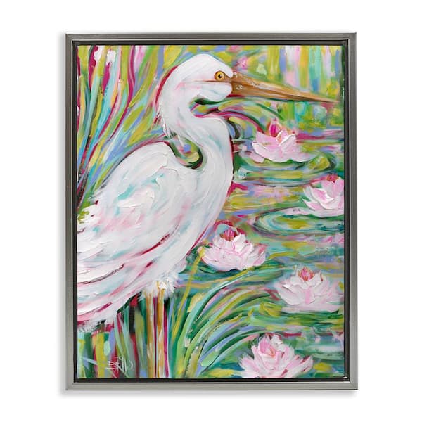 Great White Egret and Lotus by Estelle Grengs Gray Floater Frame Animal Graphic Art Print 31 in. x 25 in.