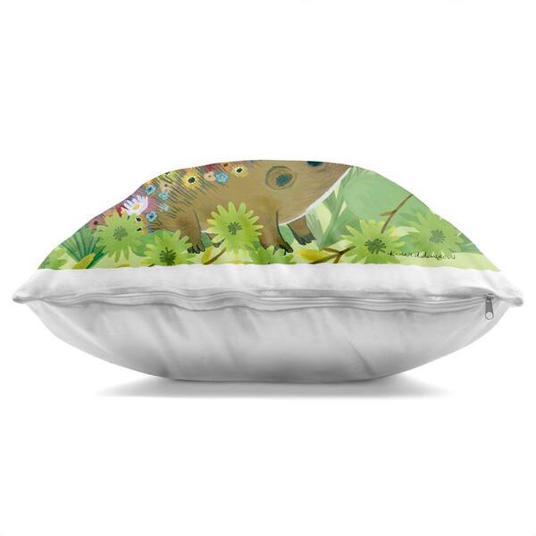 Happy Hedgehog and Flowers Green Abstract Polyester 18 in. x 18 in. Throw Pillow