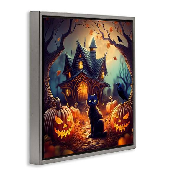 Haunted House and Black Cat by Alina Georgescu Gray Floater Frame Animal Graphic Art Print 25 in. x 25 in.