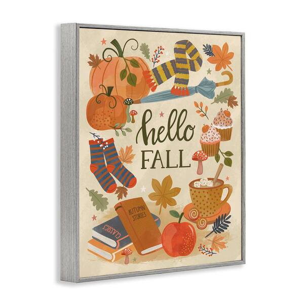Hello Fall Cozy Autumn Items by Lisa Perry Whitebutton Gray Framed Graphic Typography Art Print 11 in. x 14 in.