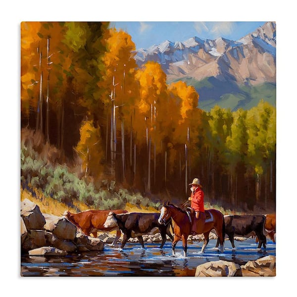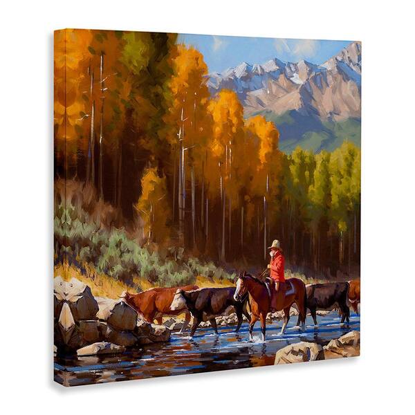Herding Cattle Through Stream by Jimmy Dyer 1-Piece Unframed Graphic Print Nature Poster Art Print 30 in. x 30 in.