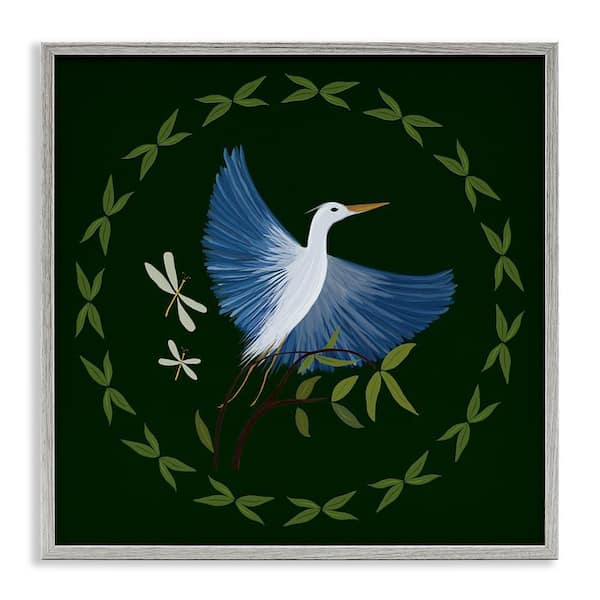 Heron and Dragonflies Wreath by Michelle Ingari Designs Gray Framed Animal Giclee Art Print 17 in. x 17 in.