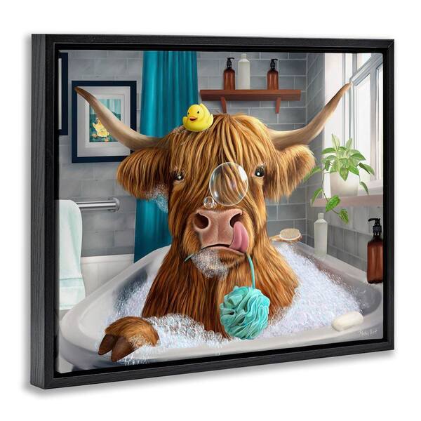 Highland Cow Bubble Bath by Mehu Art Black Floater Frame Animal Graphic Art Print 17 in. x 21 in.