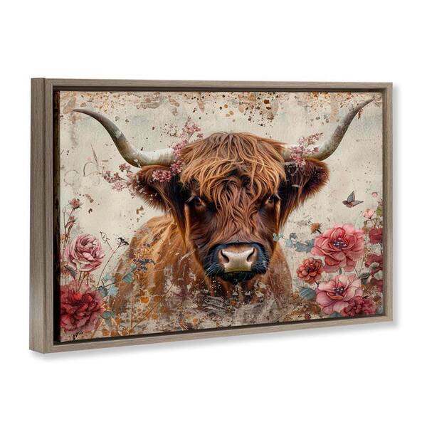 Highland Cow in Spring by LSR Design Studio Brown Floater Frame Animal Graphic Art Print 17 in. x 25 in.