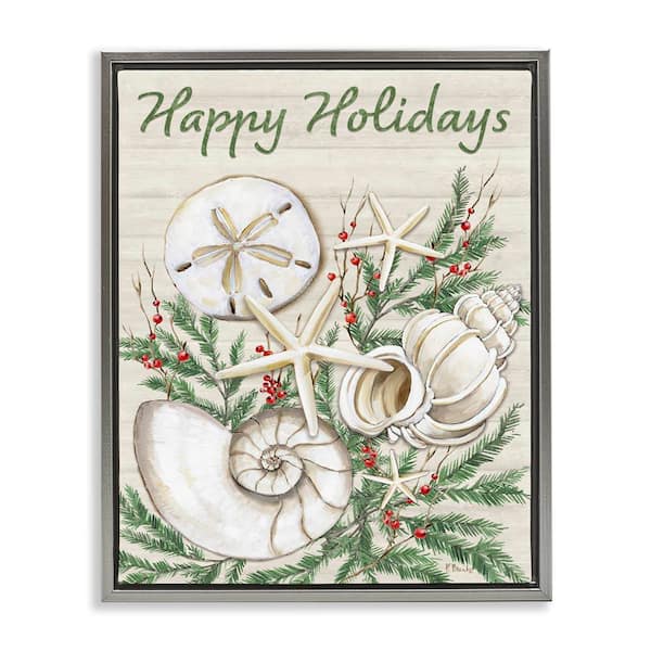 Holiday Seashells and Holly by Paul Brent Gray Floater Frame Typography Graphic Art Print 31 in. x 25 in.
