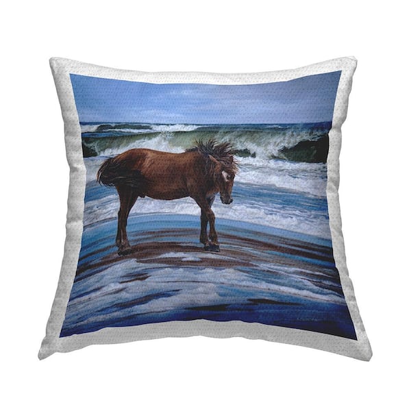 Horse on Sea Shore Blue Square Outdoor Throw Pillow