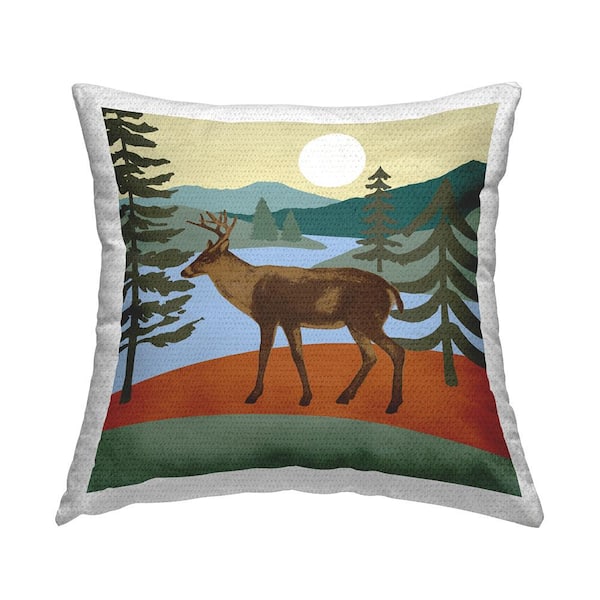 Lakeside Mountain Peaks Woodland Forest Deer Multi-Color Square Outdoor Throw Pillow