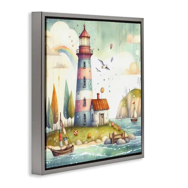 Lighthouse Cottage Scenery by LSR Design Studio Gray Floater Frame Coastal Graphic Art Print 25 in. x 25 in.