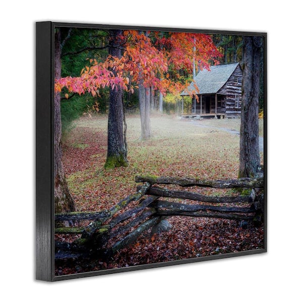 Log Cabin Woody Autumn Foliage by Rick Berk Black Framed Graphic Nature Art Print 30 in. x 24 in.
