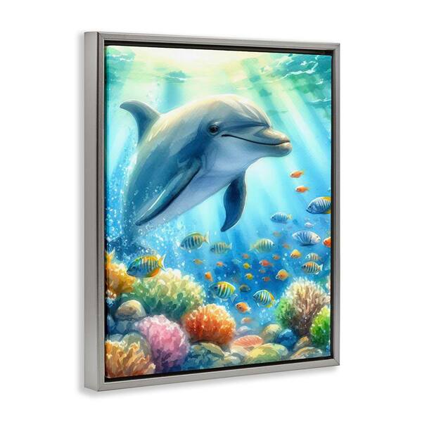 Majestic Dolphin Underwater by LSR Design Studio Gray Floater Frame Coastal Graphic Art Print 31 in. x 25 in.