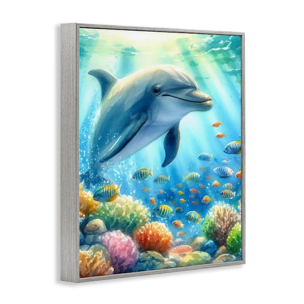 Majestic Dolphin Underwater by LSR Design Studio Gray Framed Coastal Giclee Art Print 14 in. x 11 in.