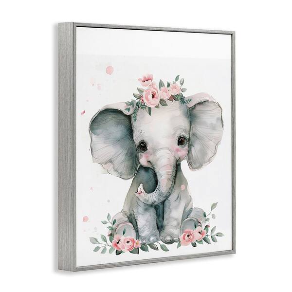 Nursery Floral Elephant by LSR Design Studio Gray Framed Animal Giclee Art Print 30 in. x 24 in.