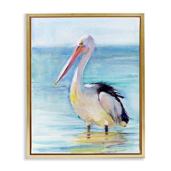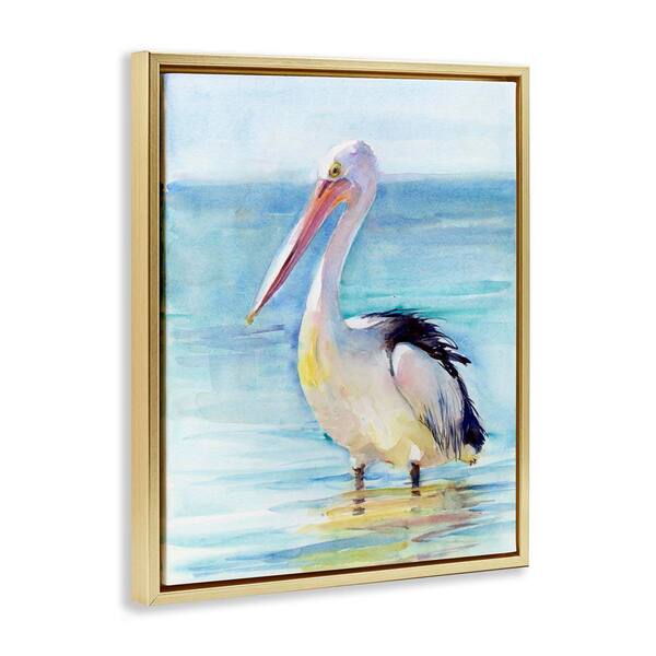 Pelican Wading in Sea by John Keeling Gold Floater Frame Coastal Graphic Art Print 21 in. x 17 in.