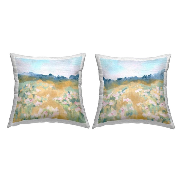 Pink Floral Meadow Landscape Tan Square Outdoor Throw Pillow 2-Pack