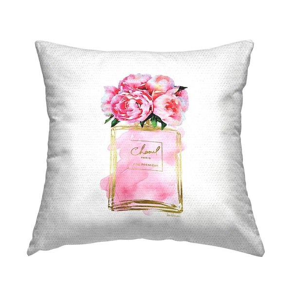 Pink Peonies in Pink Fashion Fragrance Bottle Pink Square Outdoor Throw Pillow