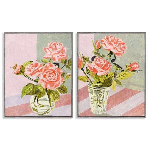 Pink Rose Bouquets in Glass by Melissa Wang 2 Pieces Gray Framed Nature Giclee Art Print 14 in. x 11 in.
