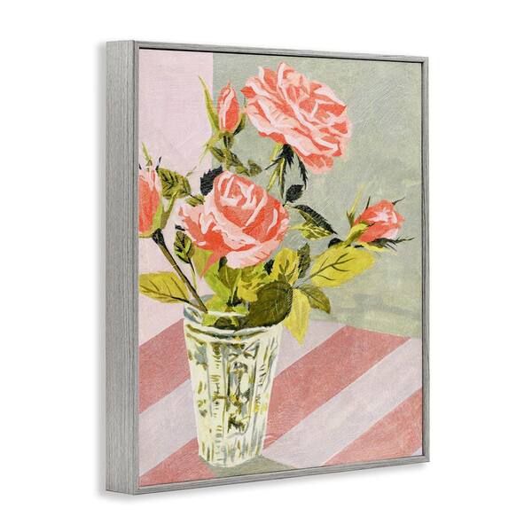 Pink Roses on Stripes by Melissa Wang Gray Framed Nature Giclee Art Print 30 in. x 24 in.