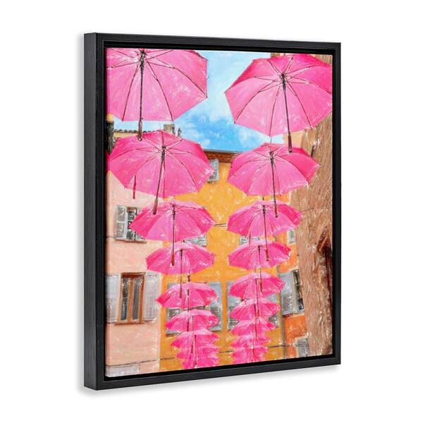 Pink Umbrellas in Town by Graffi Tee Studios Black Floater Frame Architecture Graphic Art Print 31 in. x 25 in.