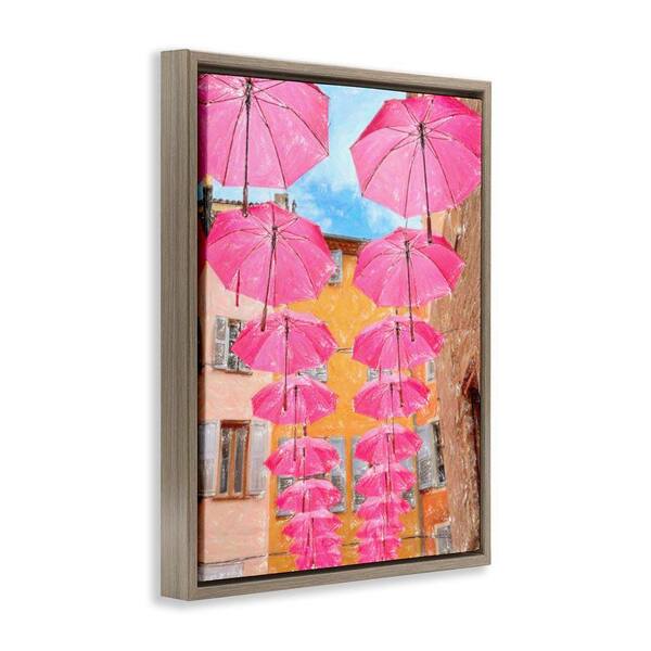 Pink Umbrellas in Town by Graffi Tee Studios Brown Floater Frame Architecture Graphic Art Print 31 in. x 25 in.