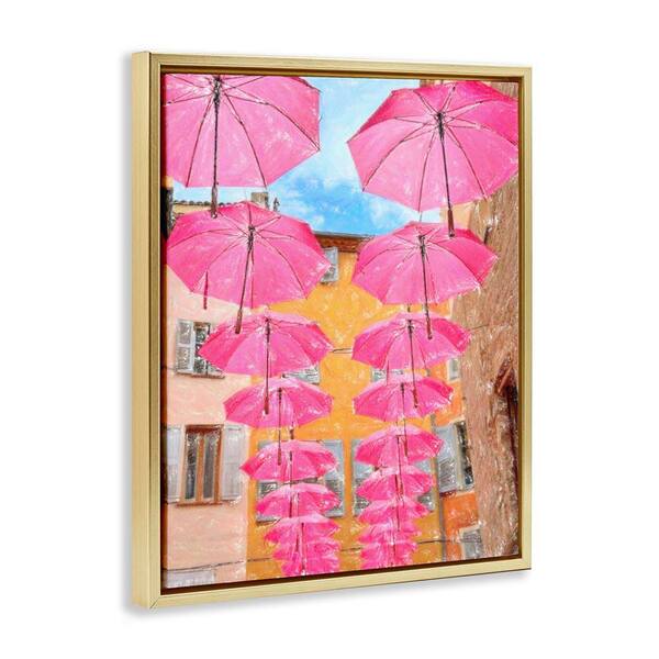 Pink Umbrellas in Town by Graffi Tee Studios Gold Floater Frame Architecture Graphic Art Print 31 in. x 25 in.