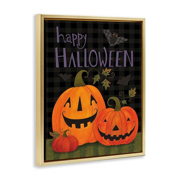 Pumpkins and Bat on Plaid by Bernadette Deming 1-Piece Floater Frame Graphic Print Typography Art Print 31 in. x 25 in.