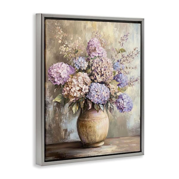 Purple Hydrangea Pottery by Petal Prints Design Gray Floater Frame Nature Graphic Art Print 31 in. x 25 in.