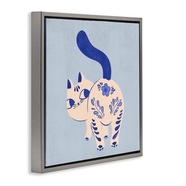 Purrcelin Patterned Cat by Carrie Cantwell Gray Floater Frame Animal Graphic Art Print 18 in. x 18 in.