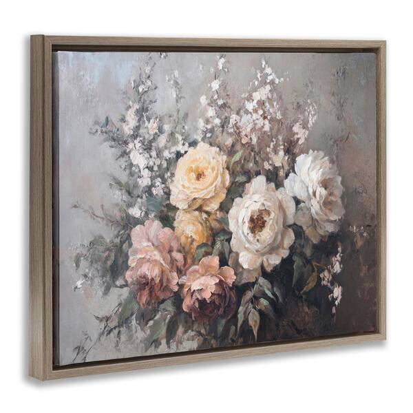 Roses and Peonies on Gray by Petal Prints Design Brown Floater Frame Nature Graphic Art Print 25 in. x 31 in.