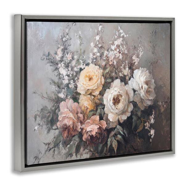 Roses and Peonies on Gray by Petal Prints Design Gray Floater Frame Nature Graphic Art Print 25 in. x 31 in.