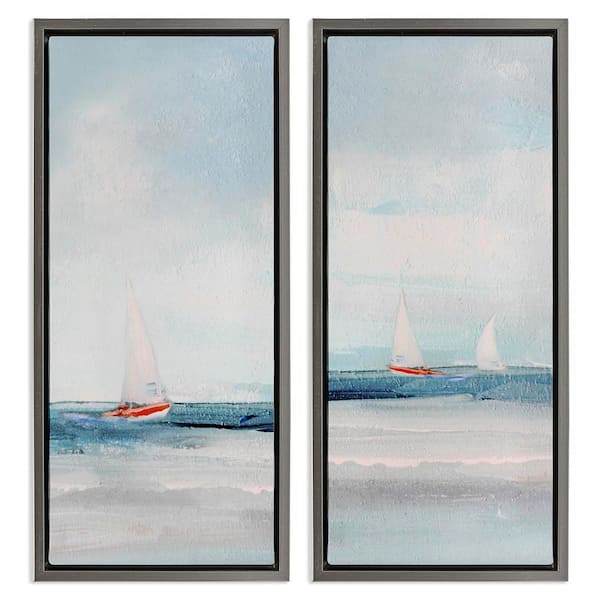Sailboats near Shoreline by Sally Swatland 2-Pieces Gray Floater Frame Coastal Graphic Art Print 25 in. x 11 in.