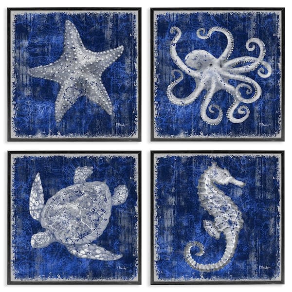 Sea Life on Abstract Blue by Paul Brent 4 Pieces Black Framed Coastal Giclee Art Print 17 in. x 17 in.