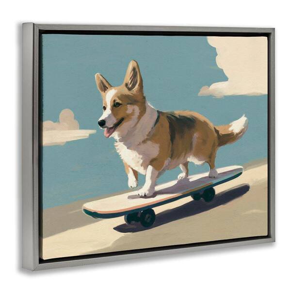 Skateboarding Corgi Dog by Svetlana Aleynikova Gray Floater Frame Animal Graphic Art Print 25 in. x 31 in.