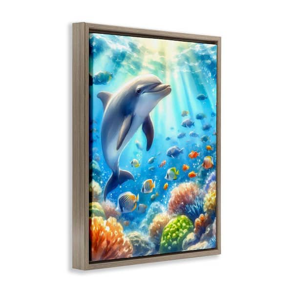 Smiling Dolphin Under Sea by LSR Design Studio Brown Floater Frame Coastal Graphic Art Print 31 in. x 25 in.