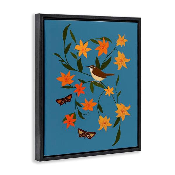 Sparrow on Lily Bunches by Michelle Ingari Designs Black Floater Frame Nature Graphic Art Print 31 in. x 25 in.