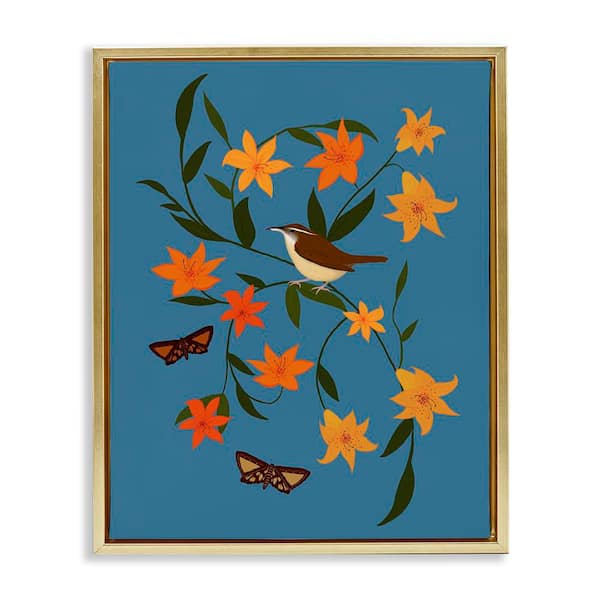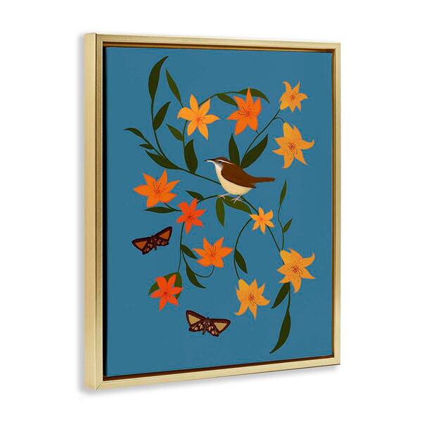 Sparrow on Lily Bunches by Michelle Ingari Designs Gold Floater Frame Nature Graphic Art Print 21 in. x 17 in.