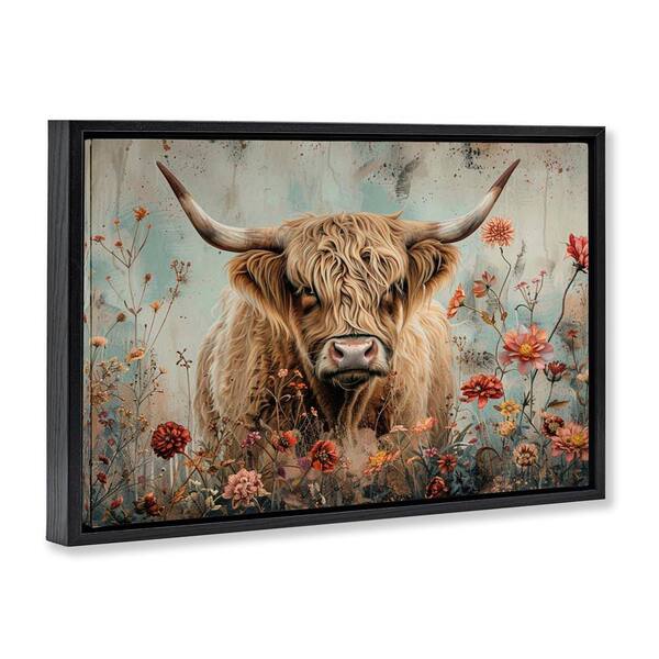 Spring Blooms Highland Cow by LSR Design Studio Black Floater Frame Animal Graphic Art Print 21 in. x 31 in.