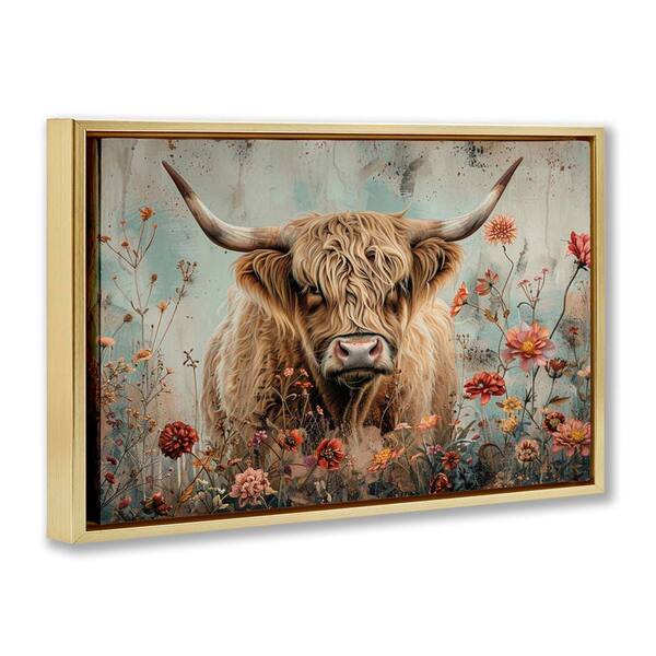 Spring Blooms Highland Cow by LSR Design Studio Gold Floater Frame Animal Graphic Art Print 17 in. x 25 in.