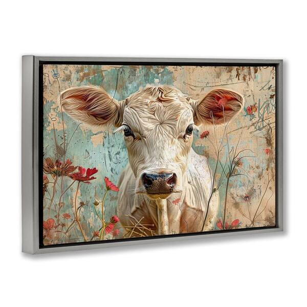Spring Country Cow by LSR Design Studio Gray Floater Frame Animal Graphic Art Print 17 in. x 25 in.