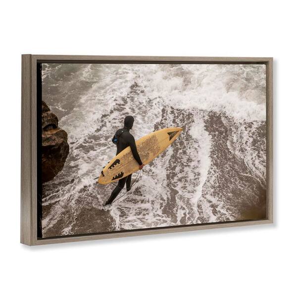 Surfer Strolling Shore by Crystal Lynn Collins Brown Floater Frame People Graphic Art Print 17 in. x 25 in.