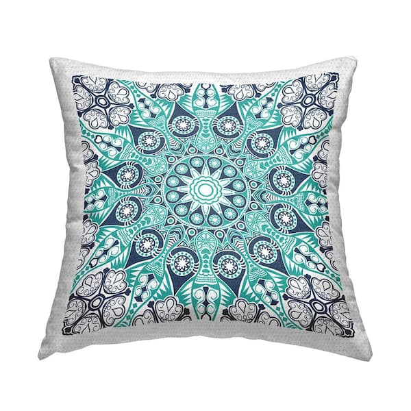 Turquoise Medallion Fractal Pattern Blue Square Outdoor Throw Pillow